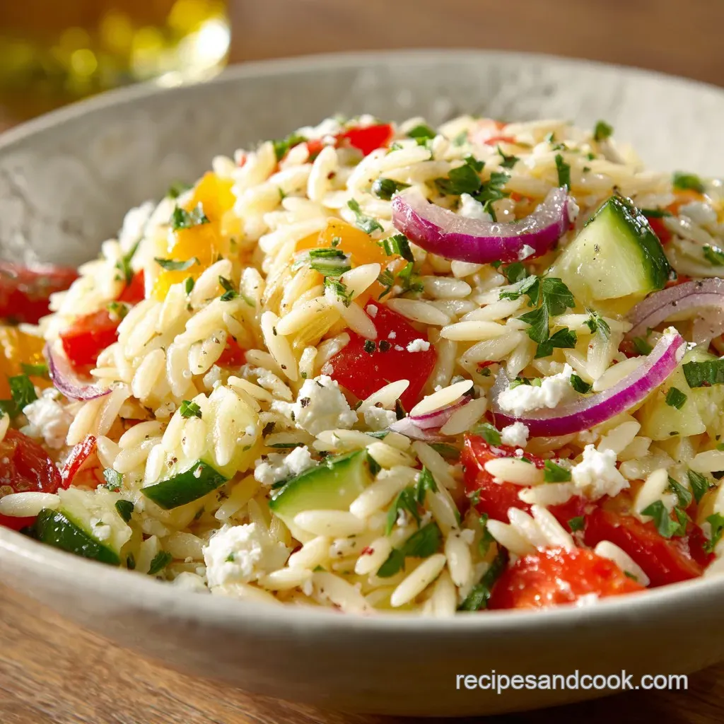 If the salad seems stiff or the orzo has hardened slightly overnight, remove it from the fridge 15– 20 minutes before serving. Toss it thoroughly. If it still feels dry, refresh it by adding a tiny splash (1 2 teaspoons) of fresh lemon juice or a small drizzle of high-quality EVOO right before serving.